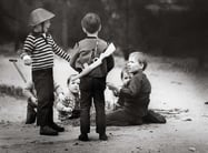 KINDER AUF EINEM HINTERHOF IN BERLIN-MOABIT. 1986. Vintage, Silbergelatineabzug. 30,0 x 44,5 cm. Photographie mit kleinem Knick. Rückseitig mit Bleistift signiert, bezeichnet u. datiert.